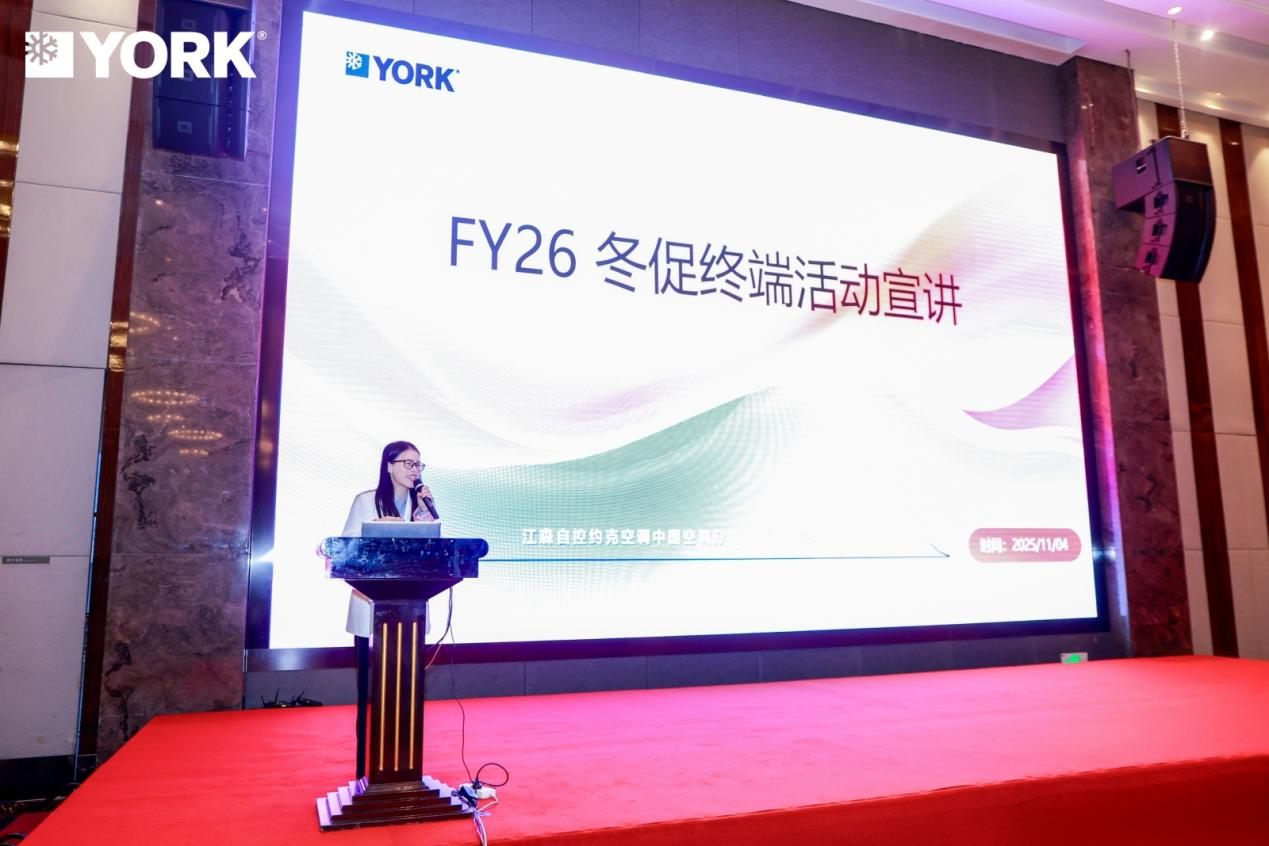 最后是FY26冬促终端活动宣讲,为助力经销商打好FY26财年的开局之战,宣讲人通过生动的案例和数据,向大家详细介绍了即将开展的冬季促销活动的方案细节和支持政策。此次活动力度空前,旨在通过一系列优惠政策和贴心服务,吸引更多消费者关注约克水生态中央空调,提升产品的市场占有率。